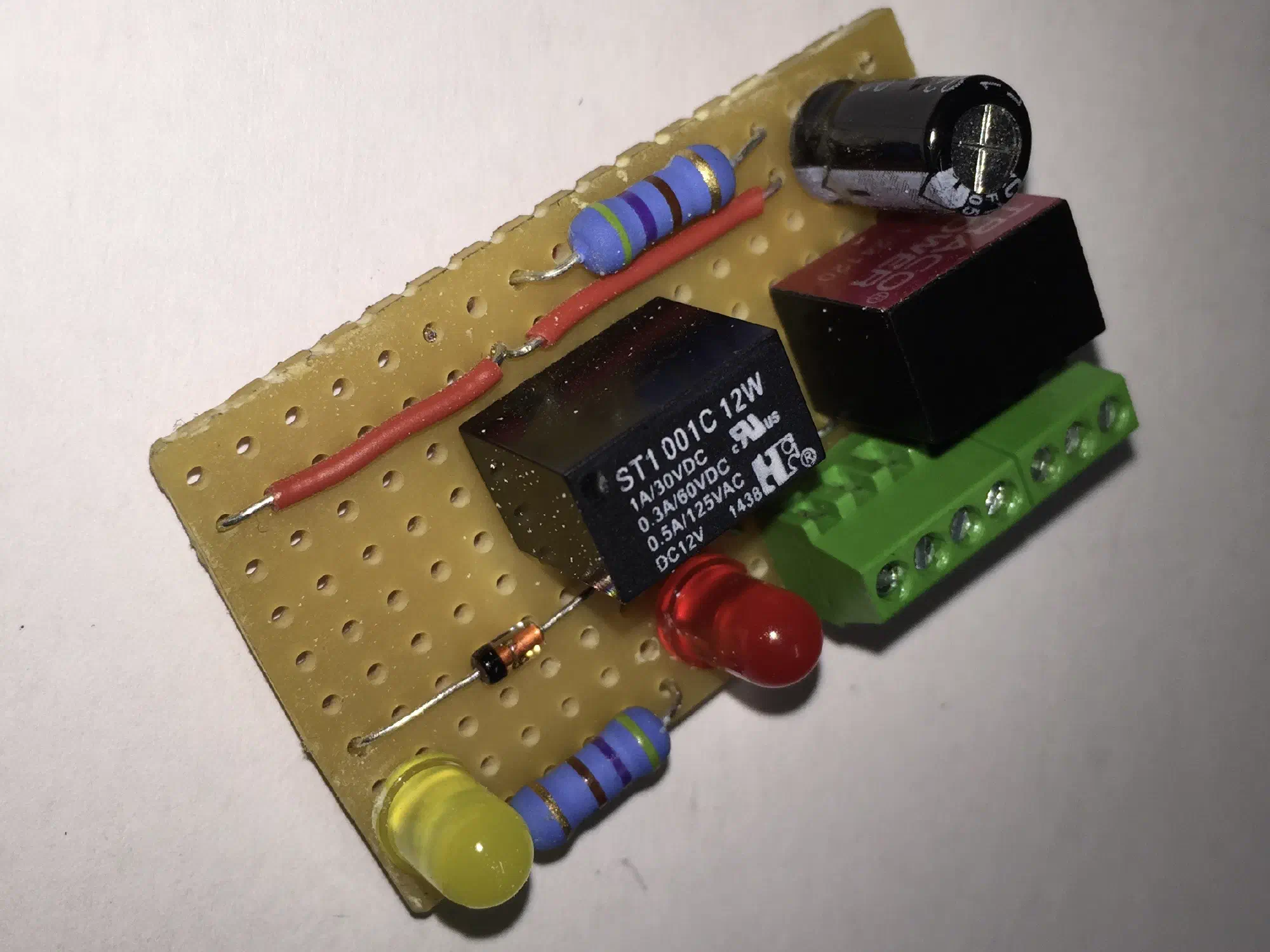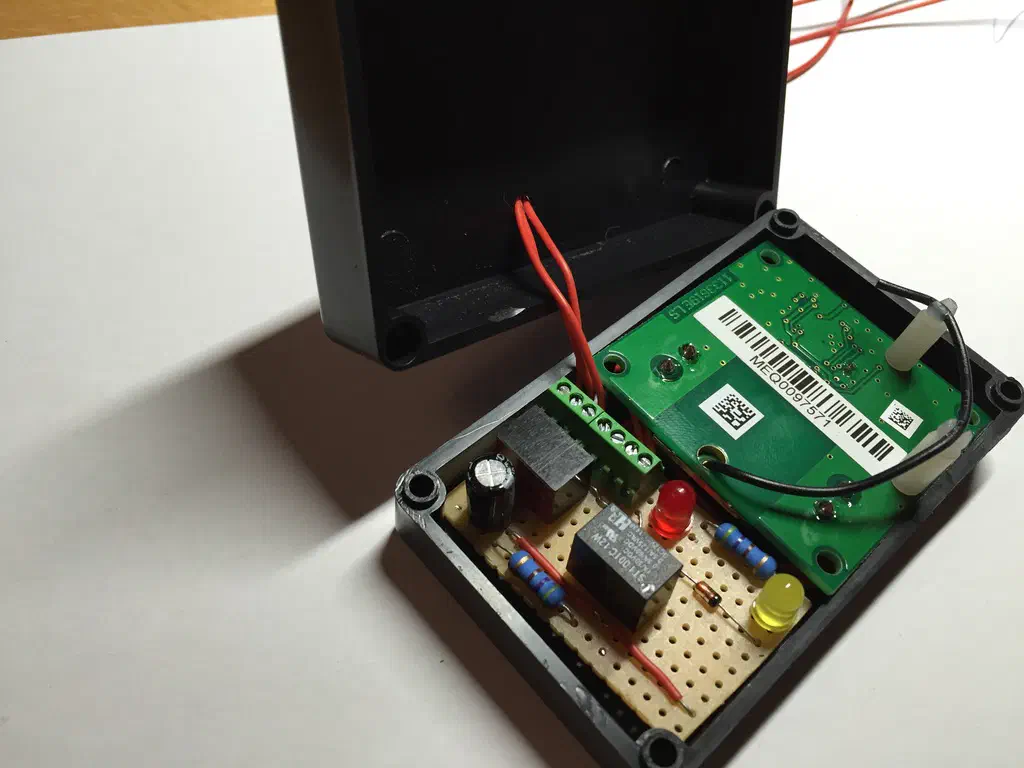 Praktischerweise kann ich mir den Betriebsstrom auch gleich an dem Garagentormotor abzapfen, der hat nämlich direkt einen ausreichend dimensionierten Ausgang, der mir 20V liefert. Mit einem kleinen Step-Down-Wandler komme ich so auf 12V mit denen ich den HomeMatic Aktor (HM-LC-Sw1-Ba-PCB) direkt betreiben kann.