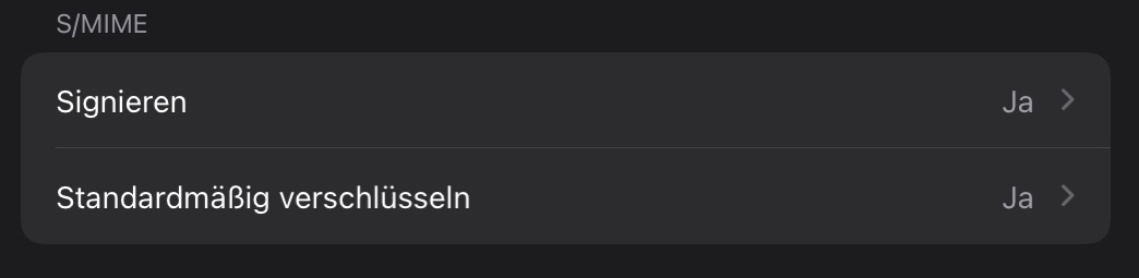 Im nächsten Schritt müssen wir den Schlüssel noch mit der E-Mail-Adresse verknüpfen, das ist leider auch hervorragend versteckt: Immer noch in der Einstellungs-App gehen wir zum Punkt Mail => Accounts, dort zum passenden Mail-Account. Wenn man dort auf “Account” geht und ganz nach unten scrollt, findet man “Erweitert”. Auch hier muss man wieder ganz nach unten scrollen und kann dort, jeweils separat zum Signieren und zum Verschlüsseln einen Schlüssel aktivieren.